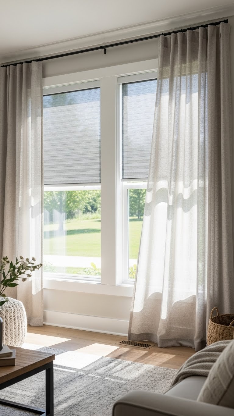 Let filtered sun soften textures; install solar shades for glare control and energy efficiency, then layer airy linen curtains to add texture and movement. You’ll create a liberated, cozy atmosphere that feels intentional and effortlessly serene.