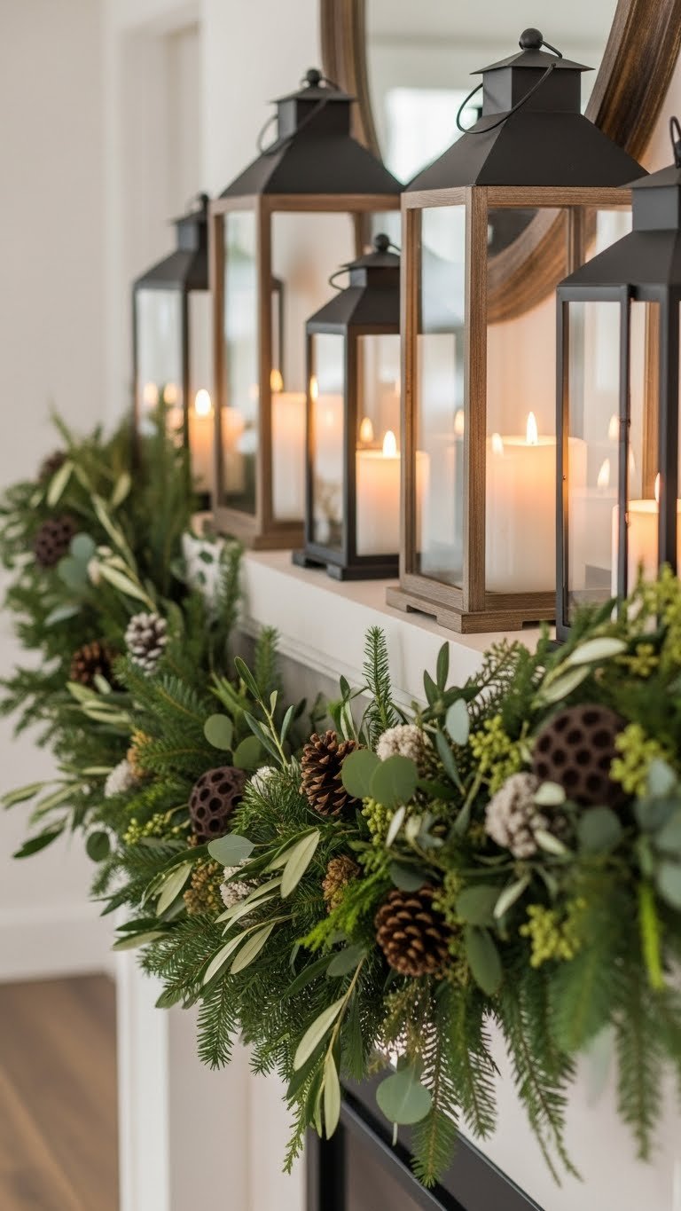 When you layer a mantel with mixed greenery and lanterns, you create an instantly curated focal point that feels both fresh and lived-in; start with a garland of varied foliage—think eucalyptus, fir, and olive—then weave in textured elements like pinecones or dried seed pods for depth.