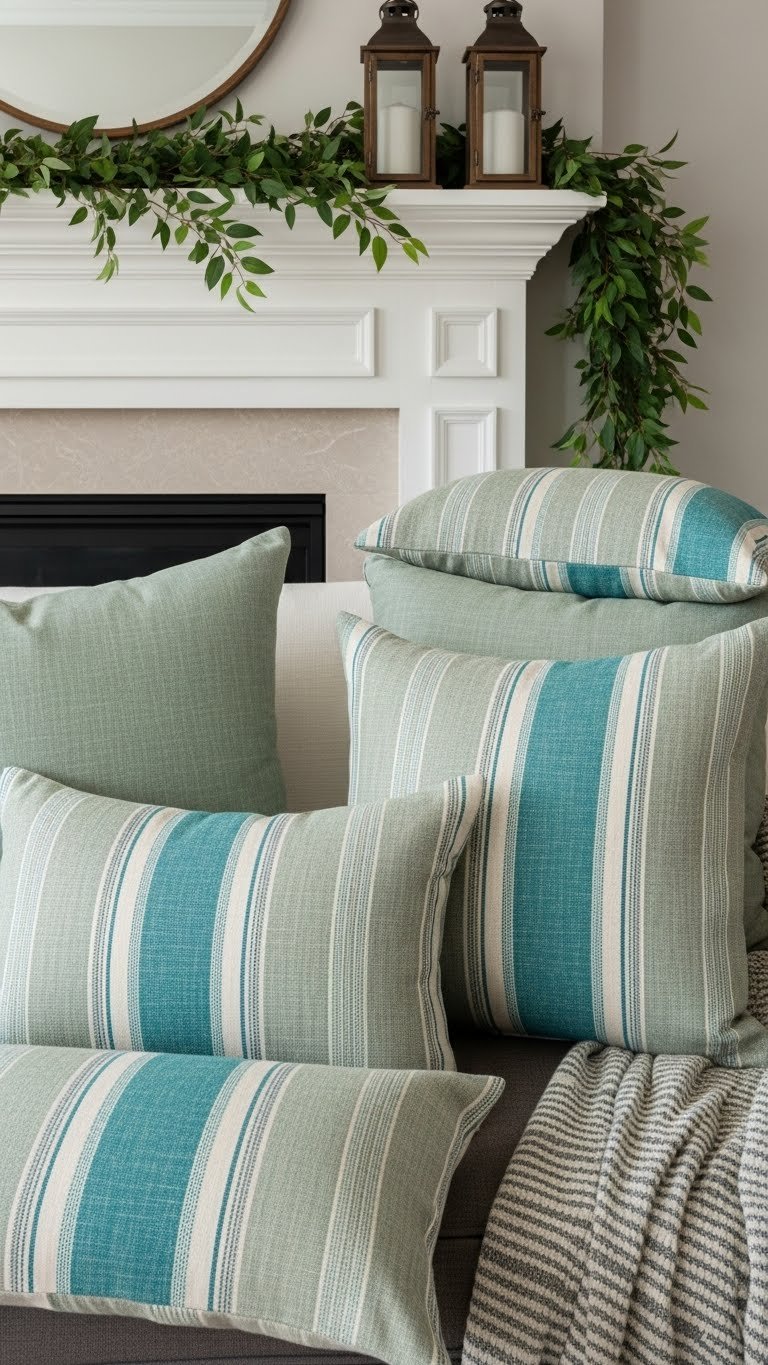 After you’ve layered greenery and lanterns on the mantel, bring the same fresh, lived-in feel to your seating by adding striped throw pillows in sage and teal.