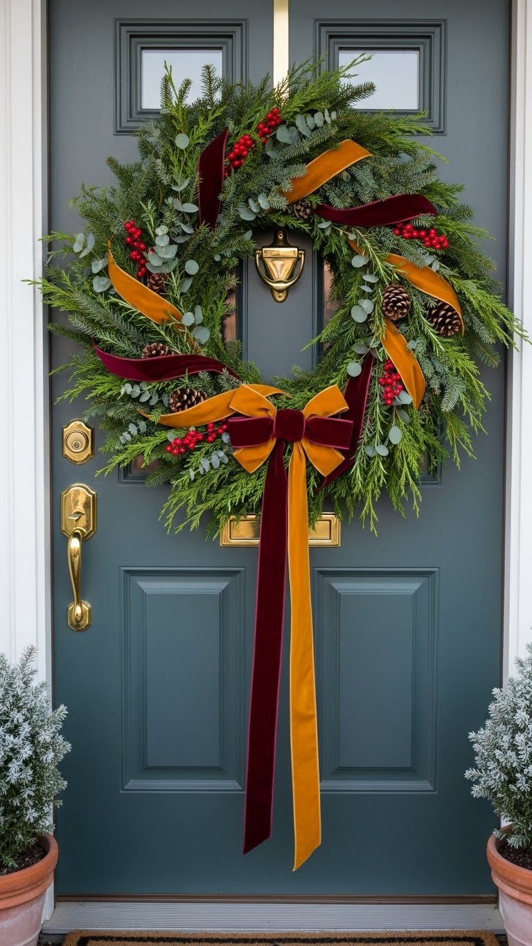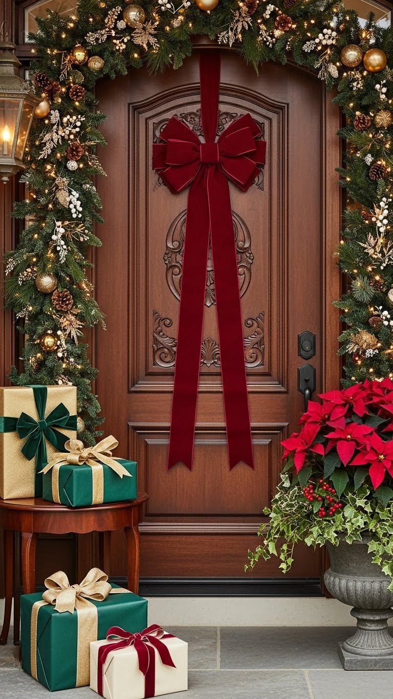 Dress your front door in timeless elegance by wrapping a full, evergreen wreath in rich velvet ribbon—its soft sheen immediately elevates curb appeal and signals thoughtful seasonal style.