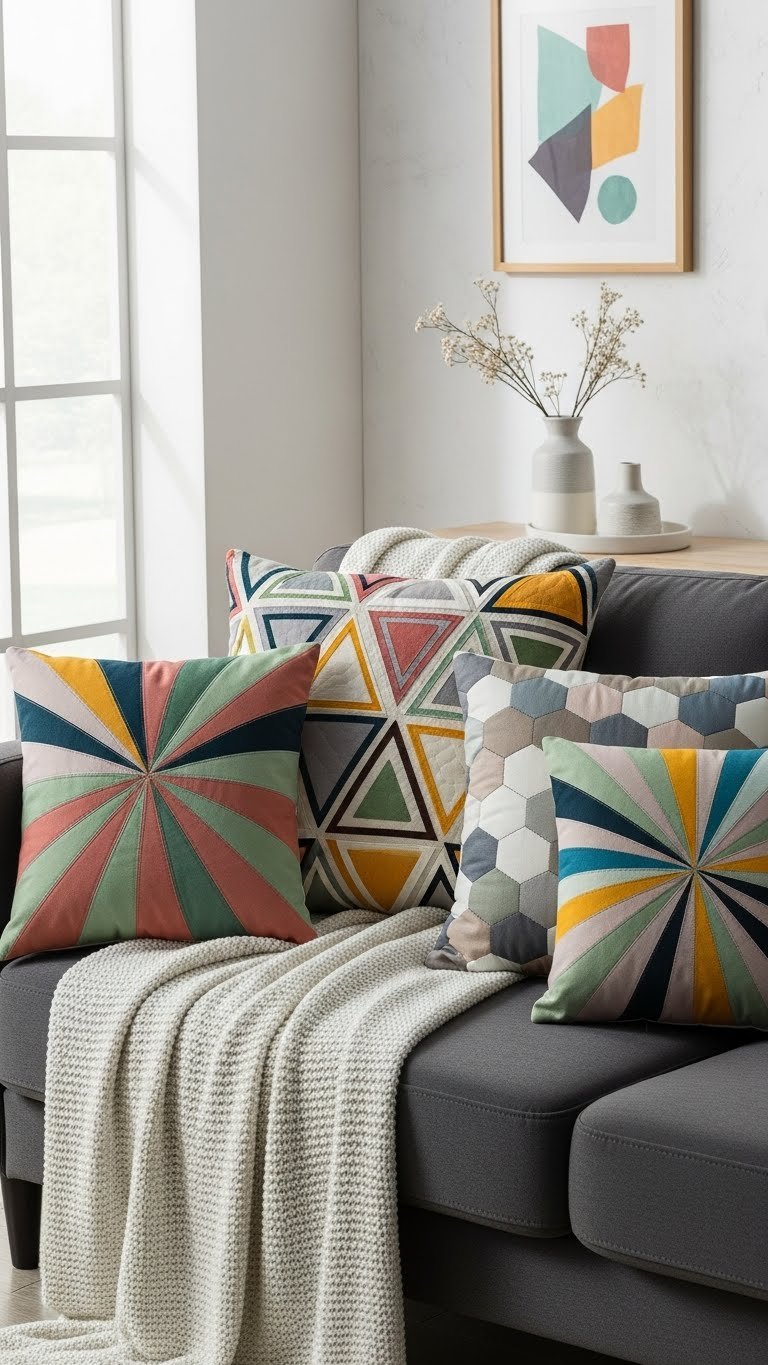 Mix muted tones with bold accents, keep scale varied, and let geometric cushions free your decor with confident, contemporary ease.