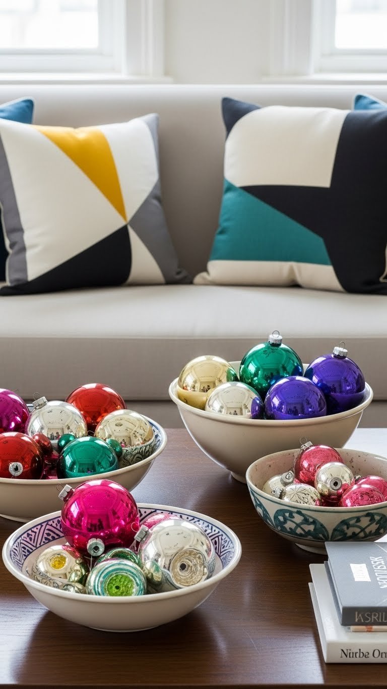 Try ornament colorblocking—grouping hues by tone—to create effortless contrast. You’ll balance patina with fresh accents, keeping the display intentional, free-spirited, and unmistakably yours.