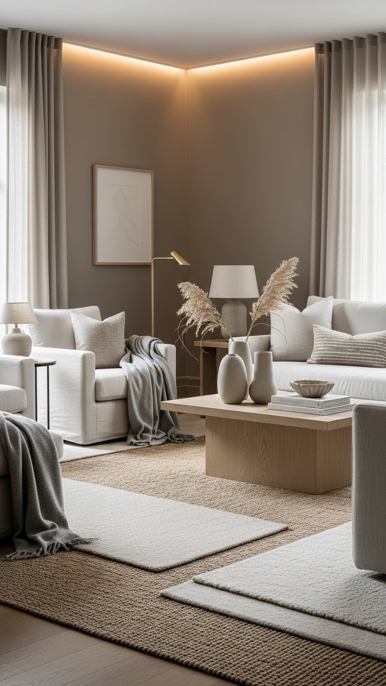 You’ll choose soft linen upholstery, warm taupe walls, and layered neutrals in rugs and accessories. Embrace muted textures—brushed wood, matte ceramics, cashmere throws—to create a calm, free-feeling space that reads modern, intentional, and effortlessly cozy.