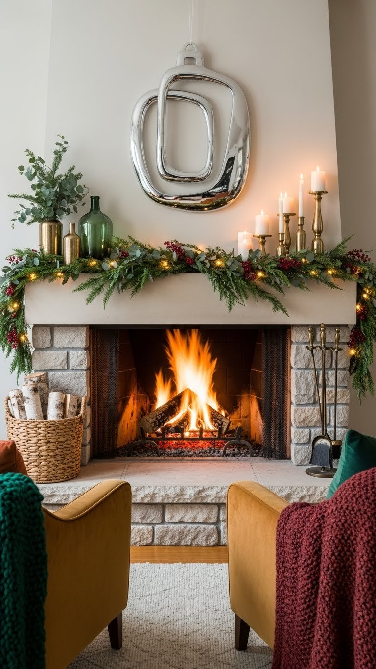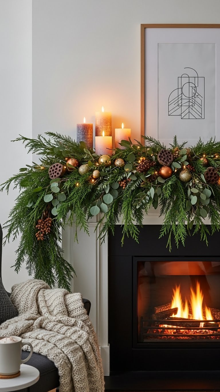 Move the same eye for texture and layered lighting from your cozy corner to the mantel to create a holiday focal point that feels collected, not staged. Layer evergreen swags with varied foliage, tuck in dried pods and metallic accents, then craft a pillar candles arrangement with mixed heights for intimacy.