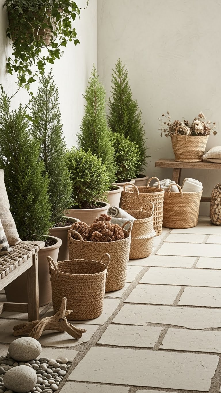 You’ll place potted evergreens in varied heights, lean natural-material baskets, and layer evergreen textures against soft natural palettes.