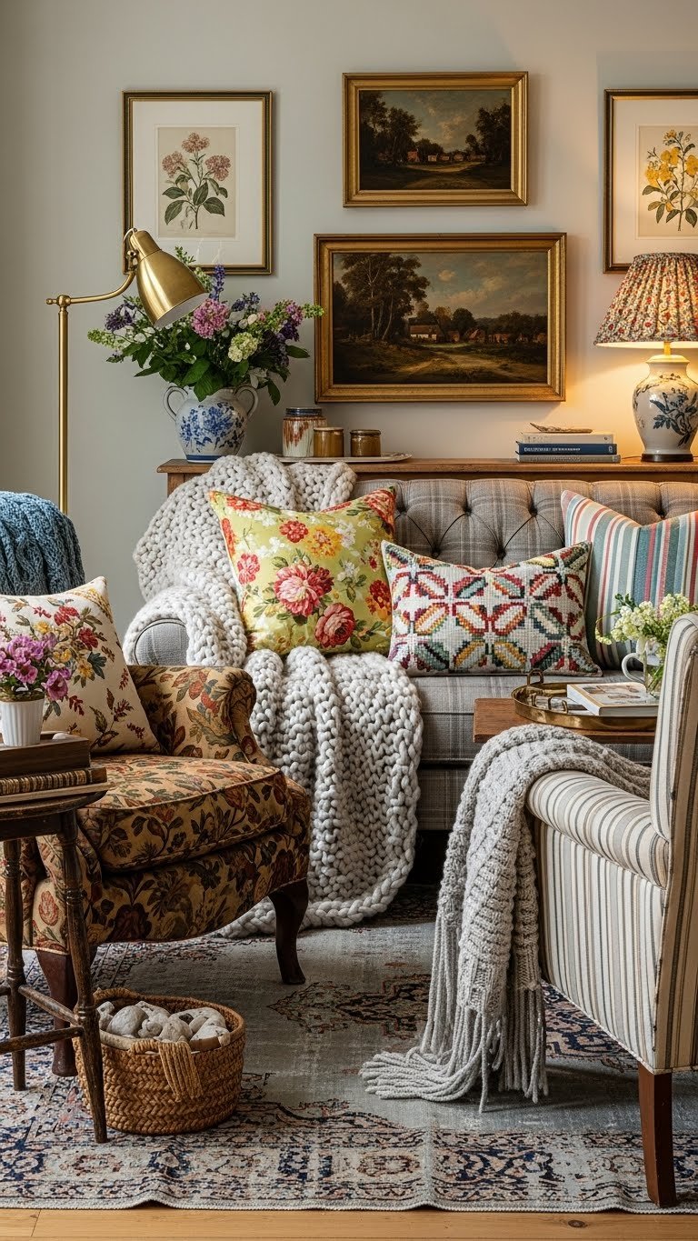 You’ll balance heritage florals with muted tufted plaids, play scale smartly, and layer texture for freedom of expression—so your seating reads curated, comfortable, and confidently modern.