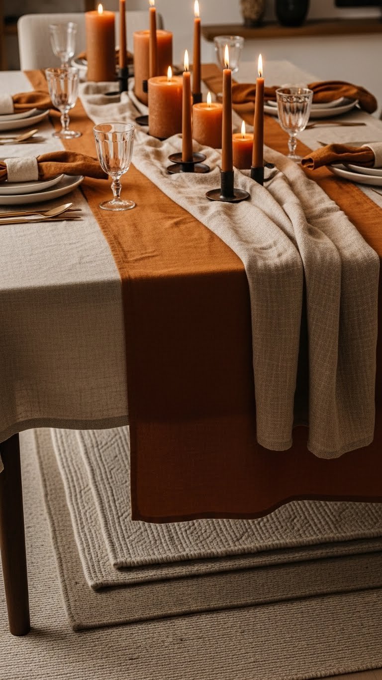 Layered rugs set the foundation for warmth, and your table deserves the same thoughtful grounding — enter a cinnamon and russet table runner topped with candles.