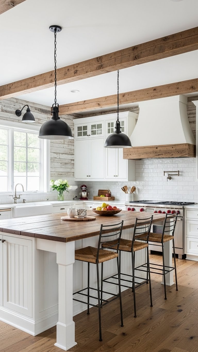 While farmhouse roots celebrate rustic charm, you’ll bring the look into the now by pairing weathered wood and shiplap with sleek warm accents—think matte black hardware, brushed brass lighting, and slim-profile appliances that add polish without losing coziness.
