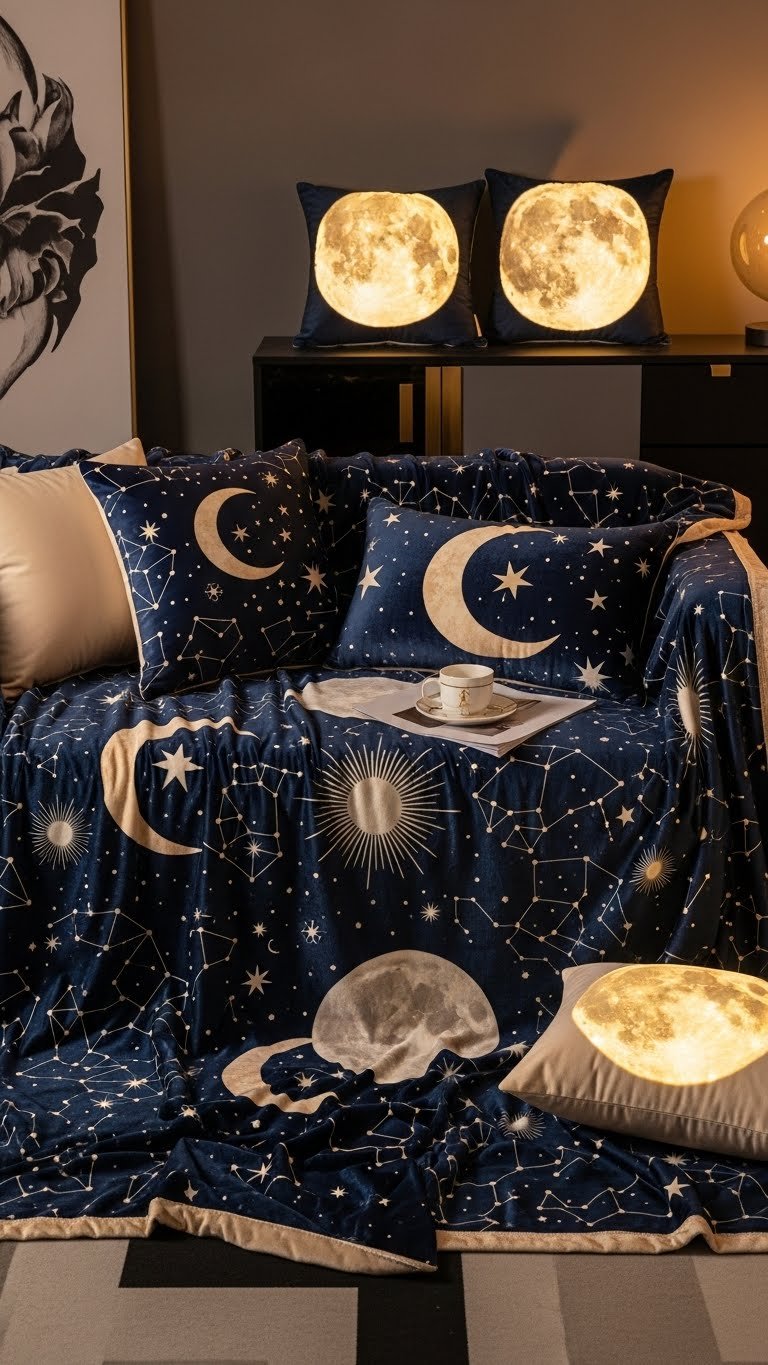 You’ll layer celestial textiles in deep navy and soft gold, balancing drama with ease. Slip on moonbeam pillows for luminous contrast, letting the set feel curated, liberating, and effortlessly modern—perfect for a home that claims its own rhythm.