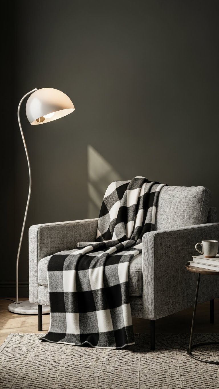 Often you’ll find that the simplest pieces make the biggest impact: tuck an oversized check blanket over the arm of a chair and pair it with a sculptural floor lamp to define a cozy corner that reads both modern and lived-in.
