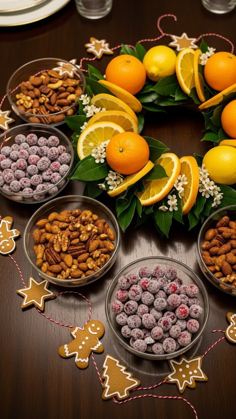 Often you’ll want your dining centerpiece to do more than look pretty — make it edible and playful so guests can nibble, mingle, and admire at once. You’ll combine a citrus wreath base with small bowls of spiced nuts, sugared cranberries, and a gingerbread garland draped loosely for charm.