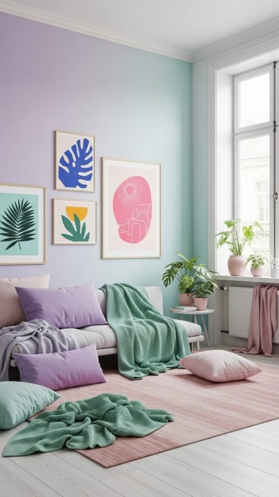 Why not soften your space with a gentle pastel palette this spring? You’ll welcome pastel gradients on walls and textiles, letting hues float without feeling precious.