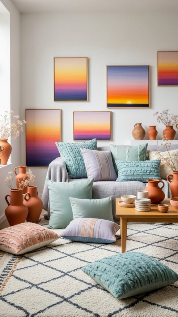 Pair those cool pastels with warm accents to keep the room feeling alive and inviting. You’ll layer sunset accents and terracotta hues via throw pillows, a cozy rug, and art that nods to evening glow.