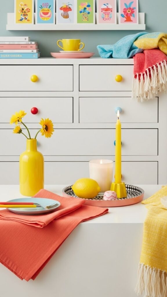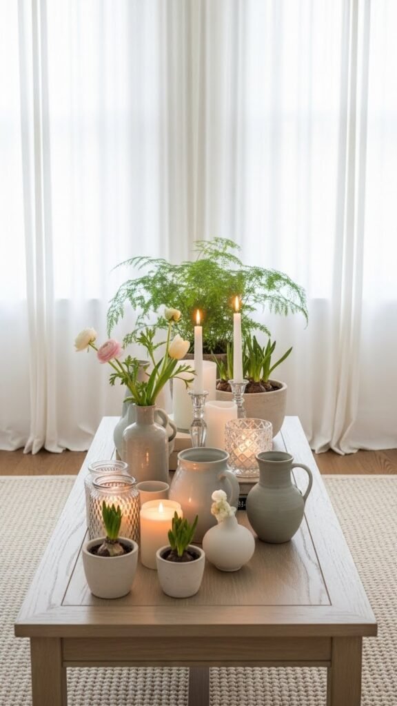 Keep momentum with tabletop vignette rotation: swap candles, ceramics, and botanicals.