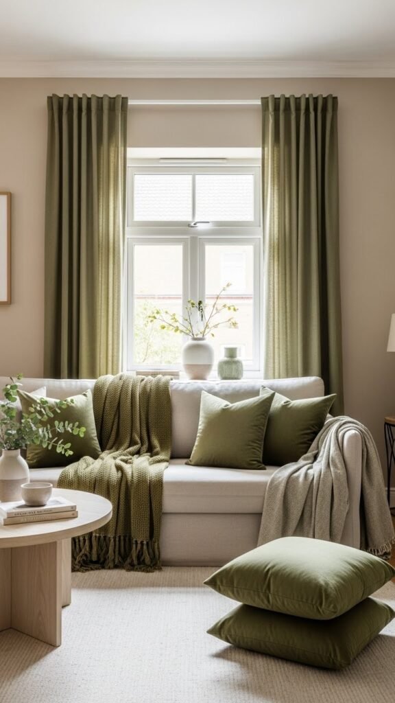 You’ll use olive contrast as a deliberate anchor, pairing tactile linen pairing pieces—throw, curtains, pillow—to keep the vibe relaxed, modern, and unapologetically free.