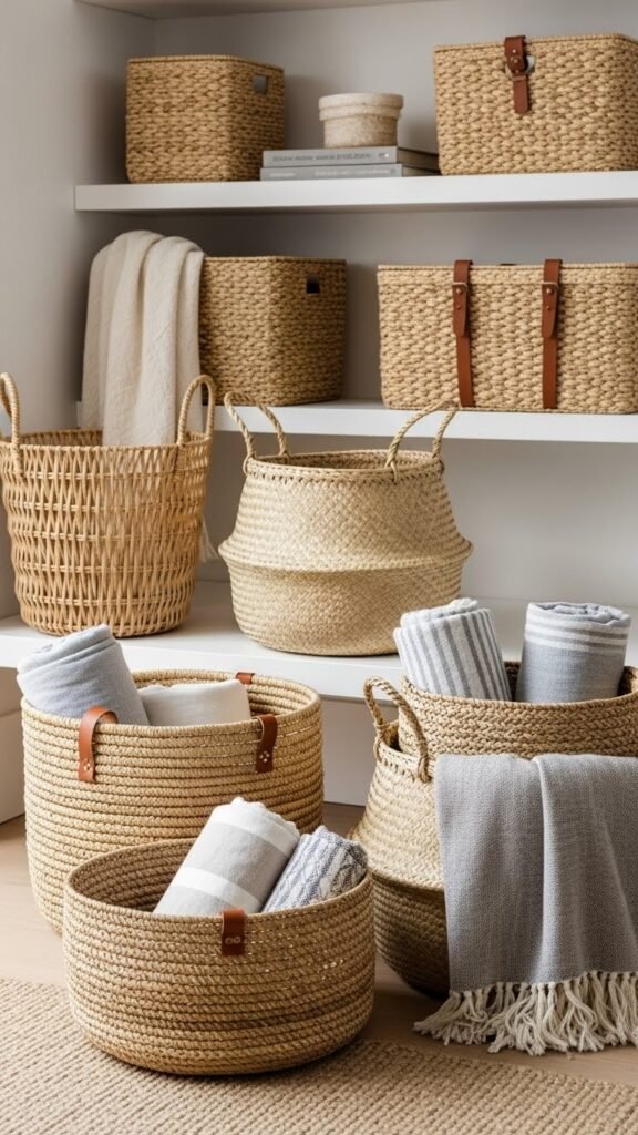Woven-basket styling turns functional storage into textural decor you’ll actually want on display. Pick natural woven baskets in varied shapes and sizes, then group them to create practical order with visual rhythm.