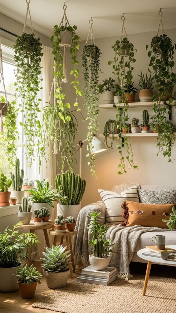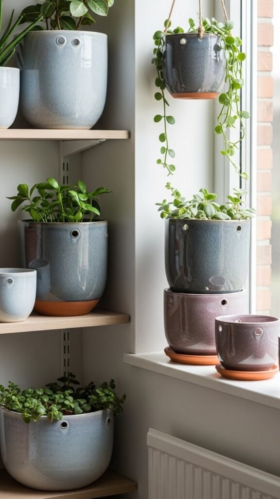 Switching from soft woven textures to the sleek curves of ceramic and terracotta planters brings a fresh structural contrast to your cozy space.