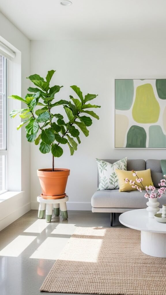 Anchor the room with a single large potted plant—think fiddle leaf fig, monstera, or a sculptural rubber plant—to create instant scale and a living focal point that grounds your spring scheme.