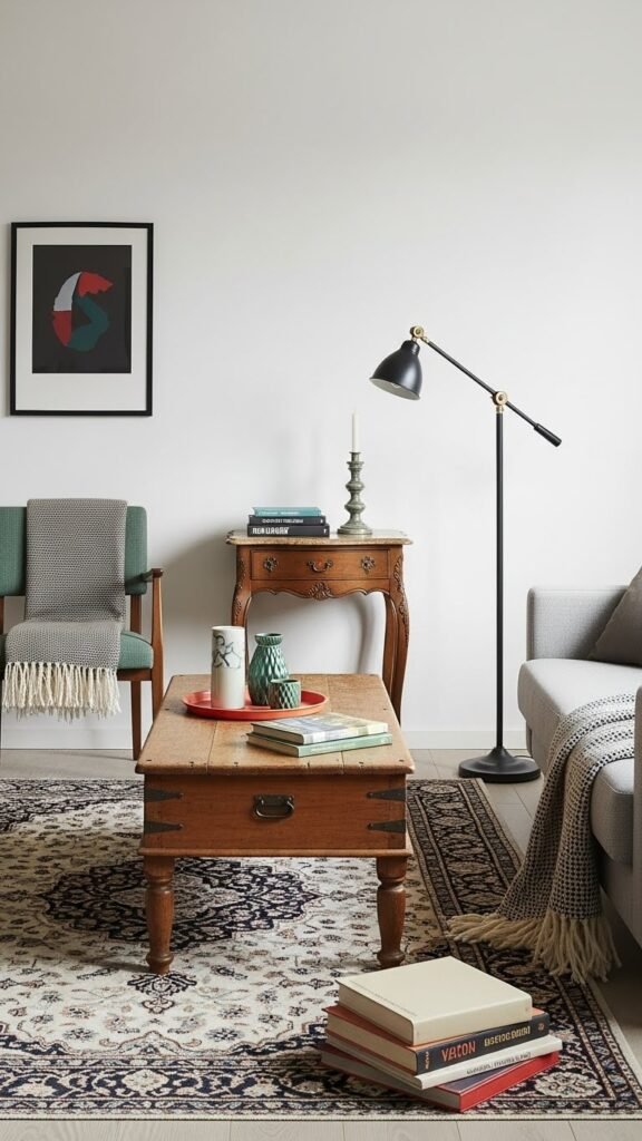 Layer in vintage pieces to ground a modern scheme and give your room personality. You’ll mix patina pairing with sleek lines, letting worn brass or faded wood sing beside minimalist forms.