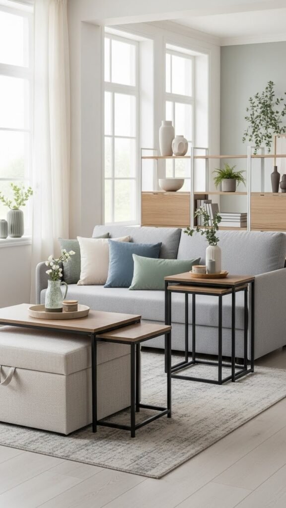 Opt for pieces that pull double duty so your room breathes without losing personality: think a slim sleeper sofa, a nesting table set that tucks away, or an ottoman with hidden storage.