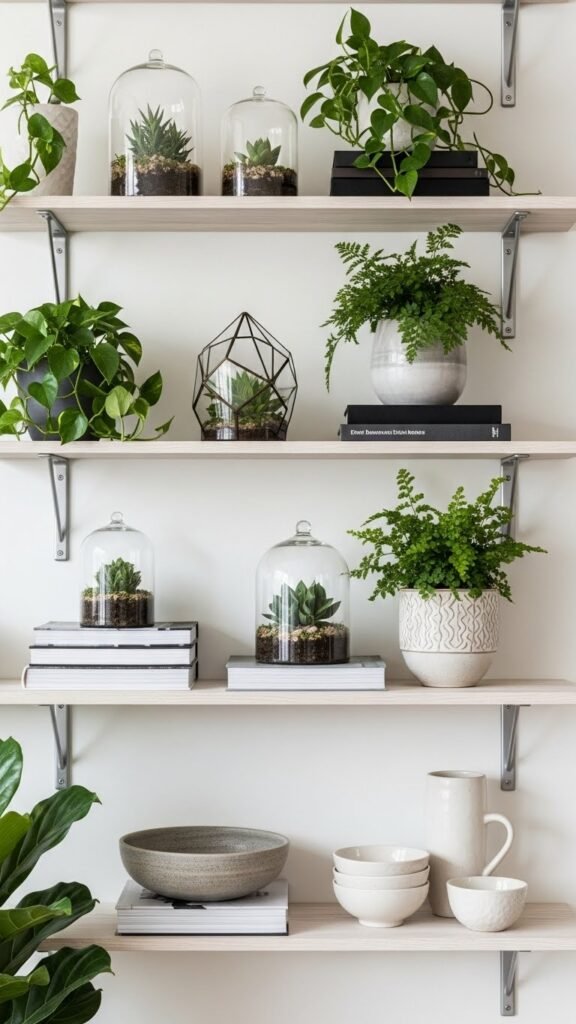 Bring life and texture to open shelving by mixing leafy plants with sculptural ceramics—keep arrangements airy so each piece can breathe. You’ll balance heights with stacked books, glass terrariums, and bowls, anchoring shelves with clean metal brackets.