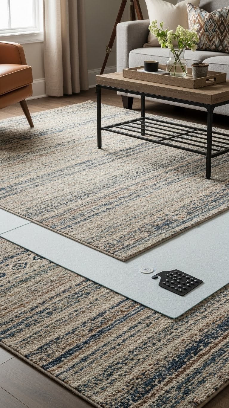 Use an underlay pad and rug gripper for safety, mix patterns with layered runners to elongate pathways, and place a statement piece as a corner anchor so each zone feels intentional and free.