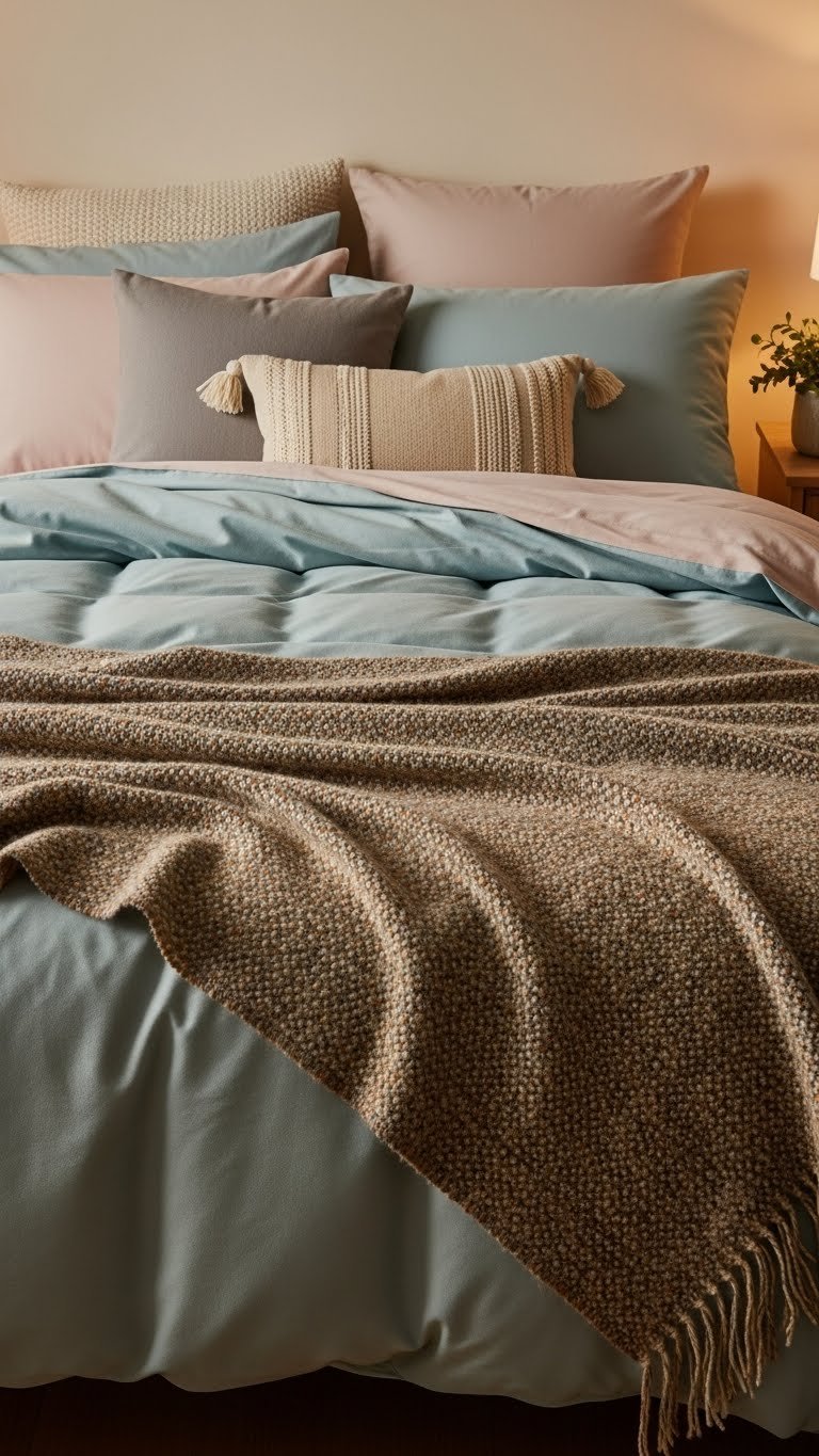 A few layered pieces—soft flannel sheets topped with a textured wool throw—give your bed a lived-in, warm look that’s as practical as it’s inviting. You’ll mix fabrics for breathable warmth, balancing snugness and airflow.