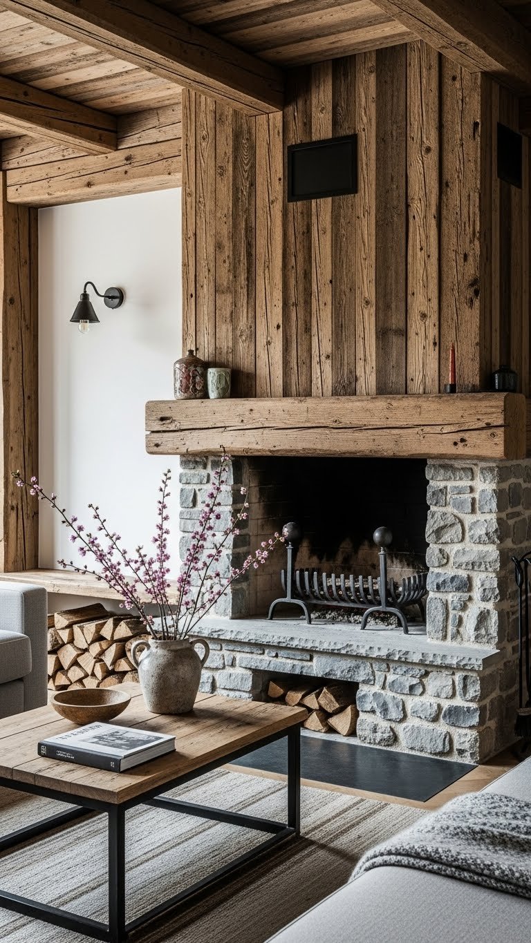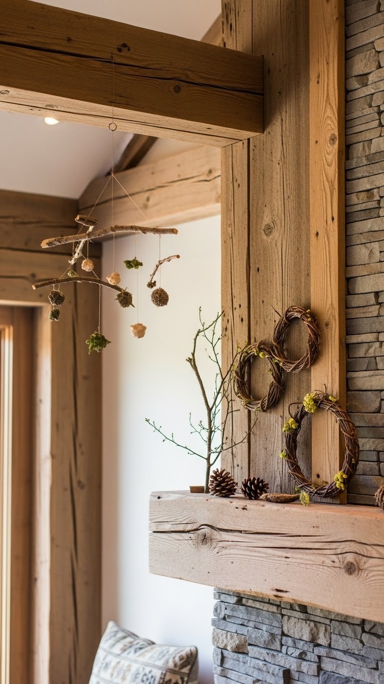You can carry the same honest, weathered warmth from reclaimed beams and riverstone into small, foraged touches that make the room feel alive.