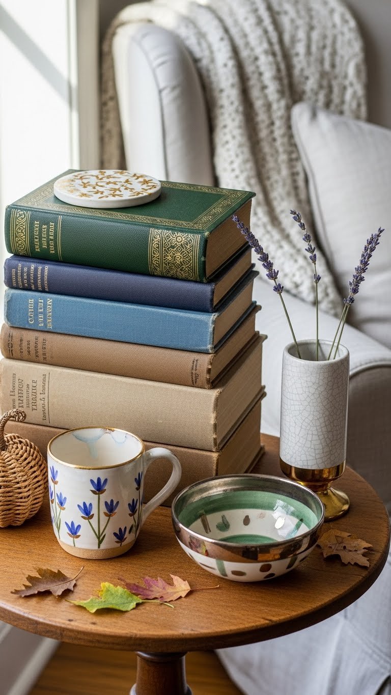 You’ll mix vintage bookbinding textures with fresh patterns, arranging spines and bowls to invite touch.