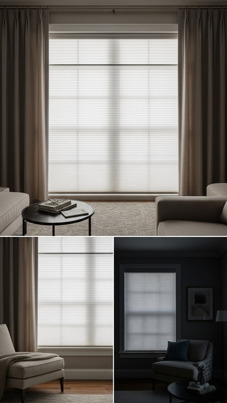 Because cold drafts creep in even through pretty windows, layering treatments gives you warmth without sacrificing style. You’ll pair insulating thermal curtains with sleek cellular shades to trap heat and soften light.