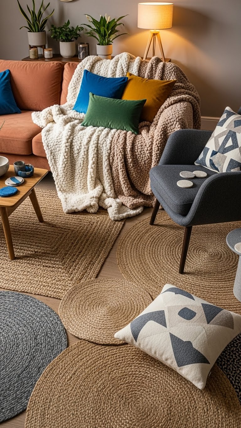 Often you’ll find that mixing jute, wool, velvet, and bouclé turns a room from flat to tactile—each fiber brings its own temperature, weight, and visual depth so you can layer comfort deliberately.