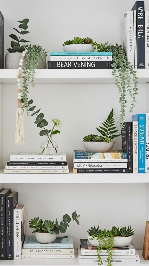 Let textured ceramics anchor clusters, tuck trailing ivy between stacks, and place mini bookends to punctuate negative space. You’ll create airy, personal vignettes that feel free, modern, and effortlessly collected.