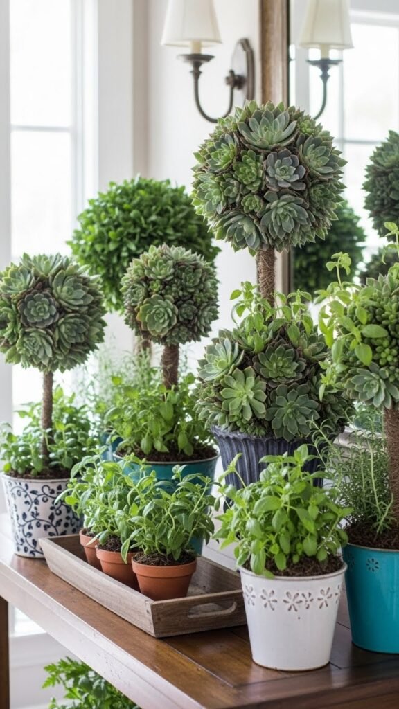 You’ll mix Succulent Topiaries and Herb Topiaries in mismatched pots, trim shapes by hand, and play with height. They’re low-maintenance statement pieces that let you express freedom, welcome guests, and refresh your foyer with confident, green style.