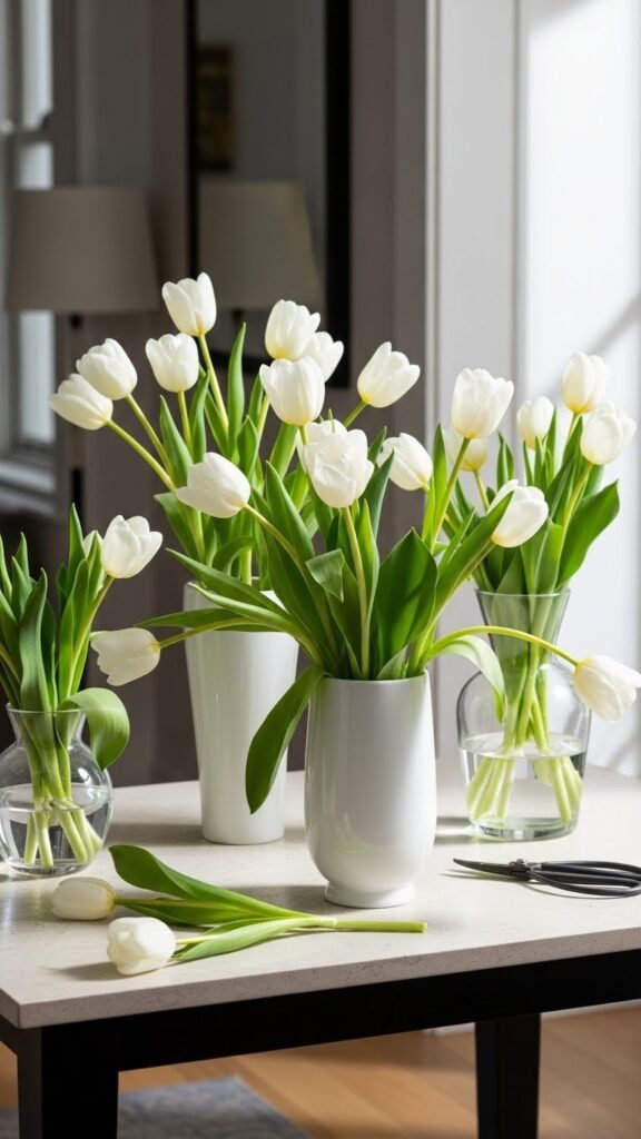 You’ll choose minimalist tulips in simple vessels, pairing airy stems with open space. Tip: refresh water, trim stems, and learn basic tulip care so blooms stay upright and free, creating a calm, modern welcome.