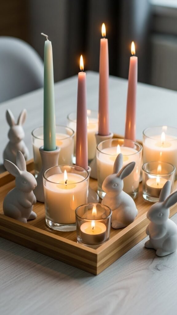 Layer candles, trays, and little ceramic bunnies to craft a vignette that feels both curated and cozy. You’ll arrange scented mixes on a low tray, add a couple of tapered and votive candles, and tuck bunny displays in between. Keep lines simple, colors fresh, and allow negative space so each piece breathes. The result feels playful, intentional, and liberating.