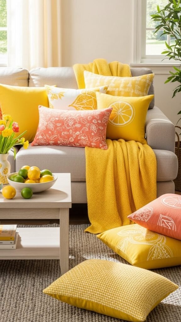You’ll mix sunny throwcases and citrus motifs to summon warmth, pairing solids with subtle prints for effortless energy.