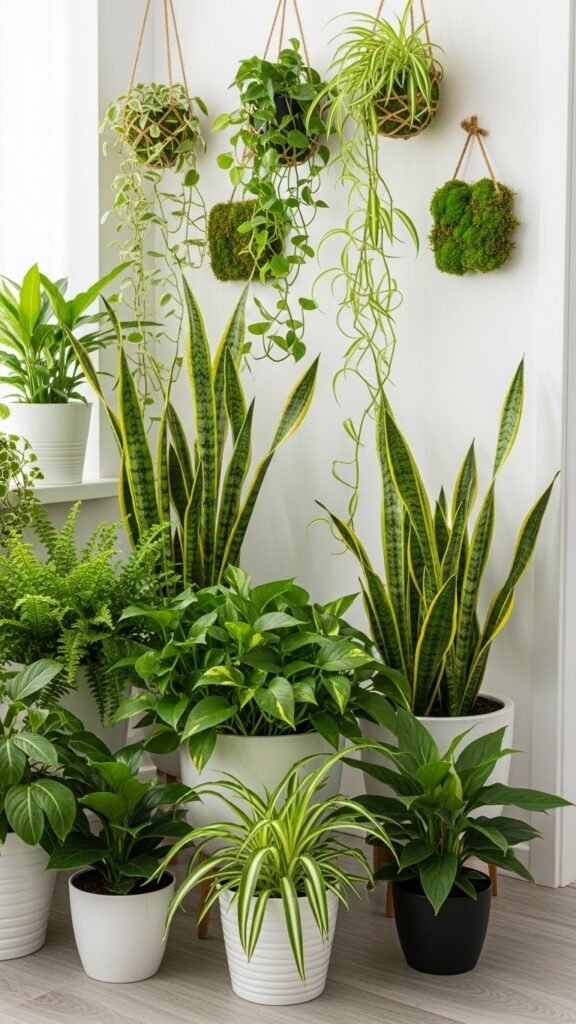 Layer in biophilic plants to instantly freshen a room and boost indoor air quality—think snake plants, pothos, and spider plants that quietly filter common toxins while looking sculptural. You’ll mix indoor ferns for softness and trailing vines for movement.