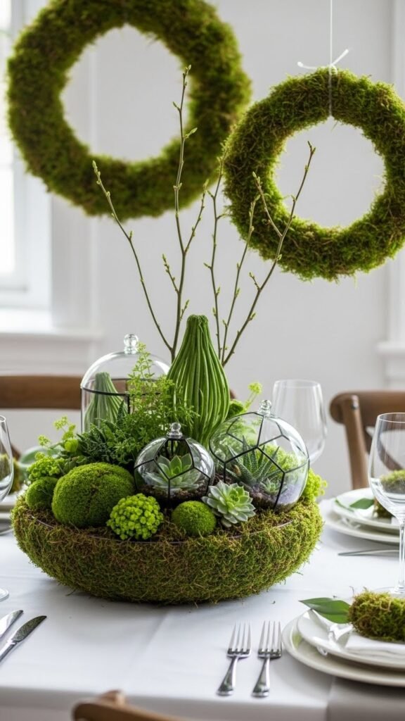 Anchor your table or console with a low, verdant moss bowl or a compact green centerpiece to instantly add texture and a live focal point to your early-spring scheme.