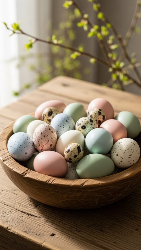 Tuck a few speckled robins’ eggs and a sing-song of small decorative nests into shallow bowls to give any surface an instant touch of spring. You’ll layer soft spring colorways—pale aqua, warm cream, muted sage—and add seasonal scentings nearby like citrus or cedar.