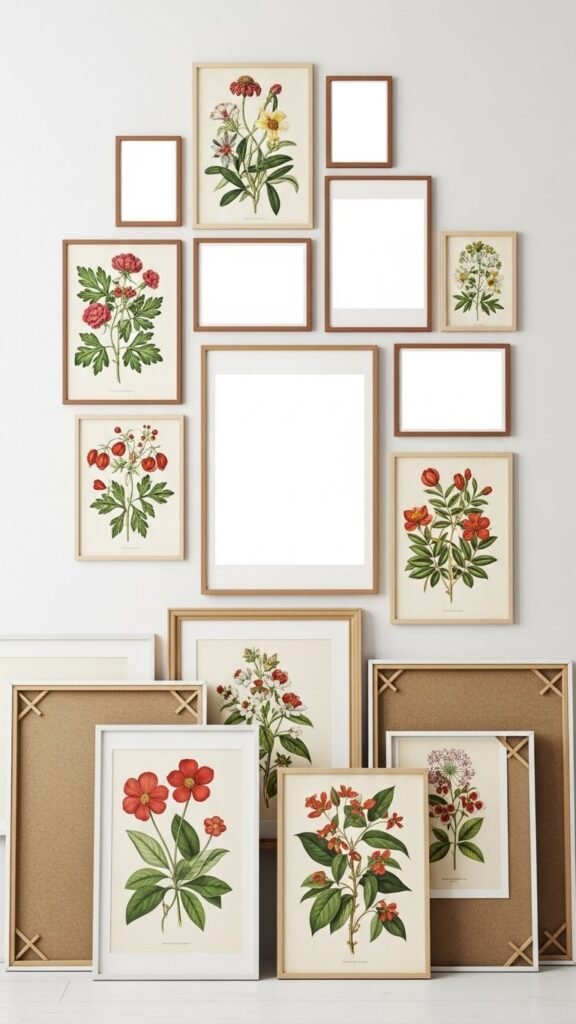 When you arrange botanical prints and a few empty frames gallery-style, you’ll give a wall instant seasonal personality without overwhelming the room.