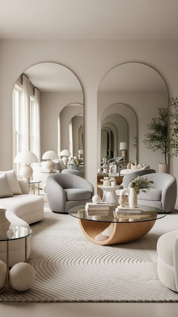 Embrace soft reflections to expand light and mood; choose rounded silhouettes in seating and tables to invite movement and ease. You’ll create a liberated, modern space that feels restful and playful, where edges relax and you move through rooms more freely.