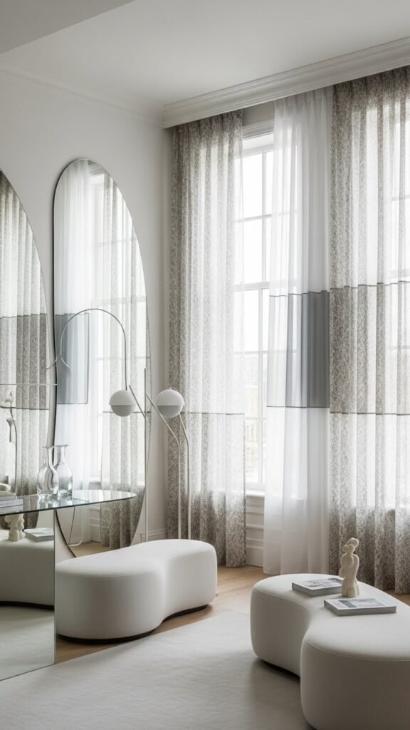 Curved mirrors and rounded furniture set a soft, flowing tone, so carry that airiness to your windows by layering sheer curtains to amplify natural light.