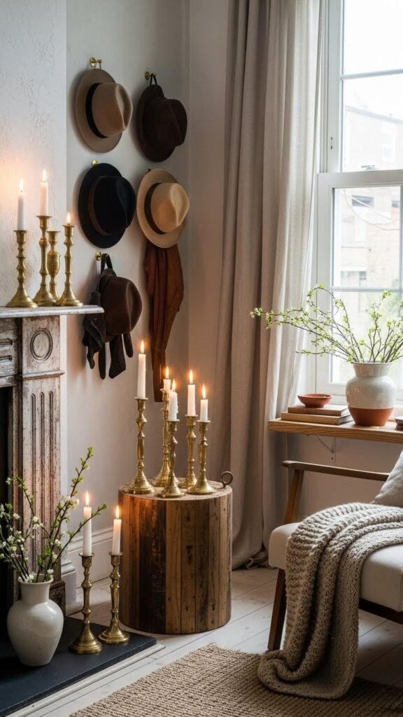 You’ll score vintage brass pieces that gleam warm and lived-in; arrange them with intention. Try playful hat styling on hooks or stacked on shelves to evoke freedom and personality.