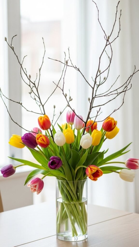 Refresh your space with a simple bouquet of tulips paired with bare branches for height and movement — the contrast feels modern and effortless. You’ll mix seasonal colorways for bold pops or serene palettes, trimming stems to balance vase mechanics and water flow.
