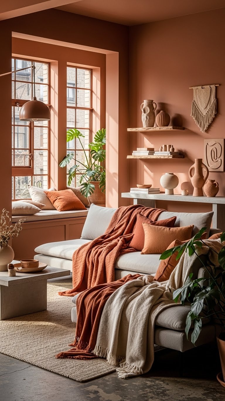 Sink into the warm, sun-baked glow of a terracotta color-drenched living room and watch your space feel instantly grounded and chic.