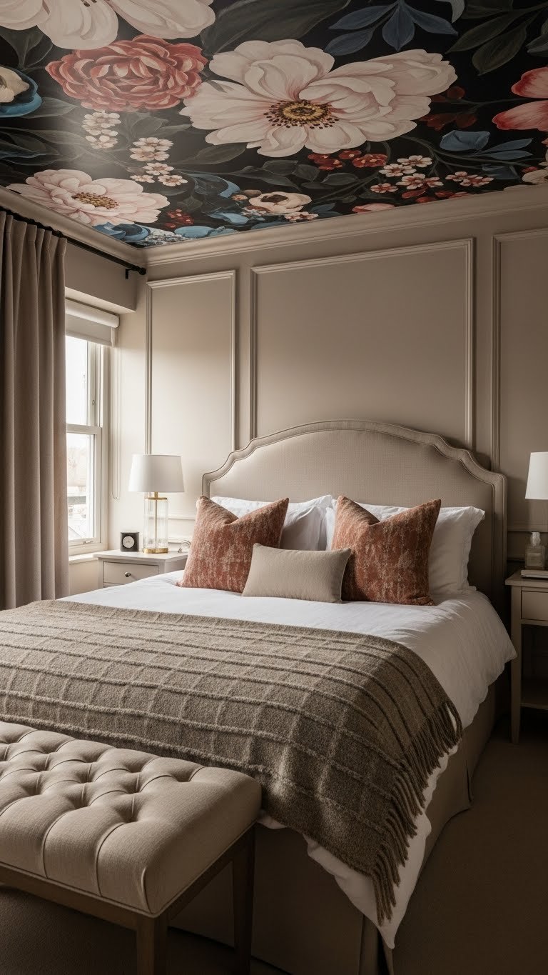 You’ll choose a hand painted ceiling effect or bold floral mural to cocoon evenings in warmth. Opt for matte textures, soft palettes, and seamless seams so the ceiling feels deliberate, liberated, and intimately romantic without overwhelming the room.