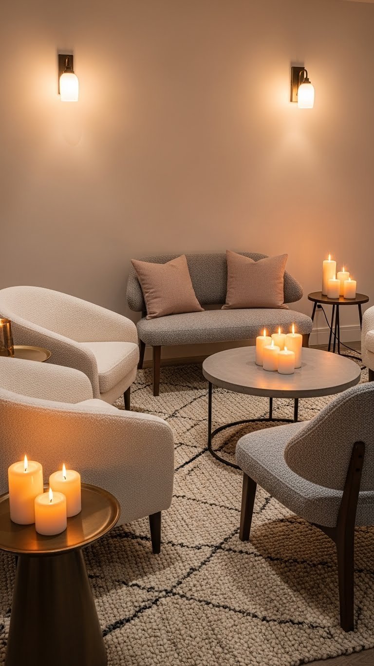 Choose curved chairs or a petite loveseat, layer a textured rug, add a small table, and use low lighting—dimmable sconces or candles—to create a liberated, warm, quietly modern vibe.