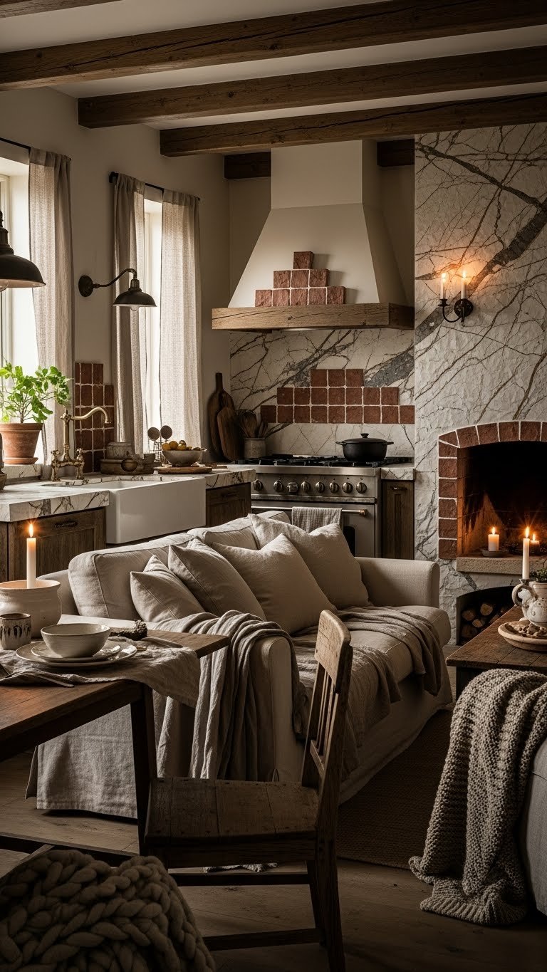 You’ll layer stone textures on countertops or accent walls, pairing raw veining with soft linens.