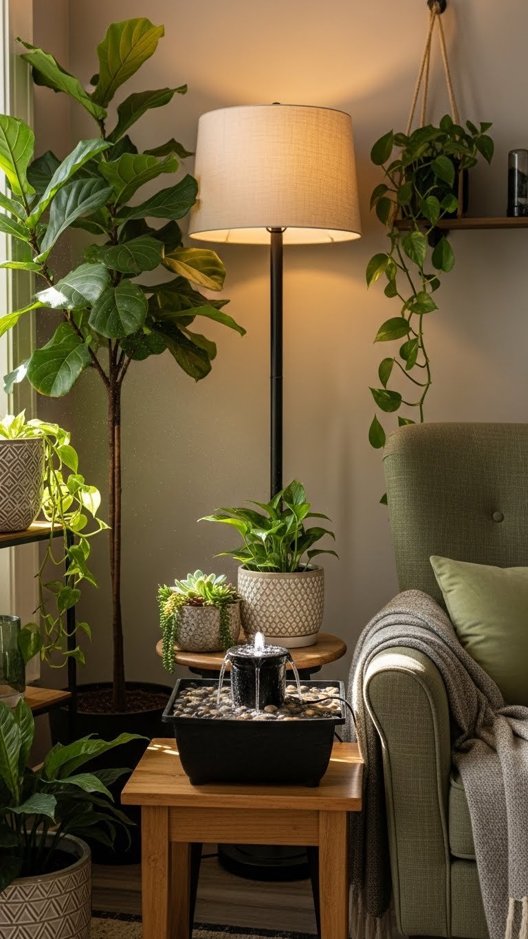 Bring a whisper of movement into your room by adding a compact water feature that layers gentle sound without stealing the show. You’ll choose an indoor fountain with a low, recyclable pump and a shallow pebble basin to anchor it.