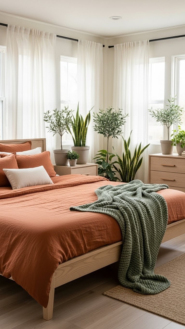 Moving from the light, minimalist calm of a Japandi living room, you can bring that same sense of serenity into the bedroom by layering warm terracotta and soft sage tones. Choose terracotta textiles for bedding and cushions, pair with sage accents in plants and throws, and keep wood finishes muted.